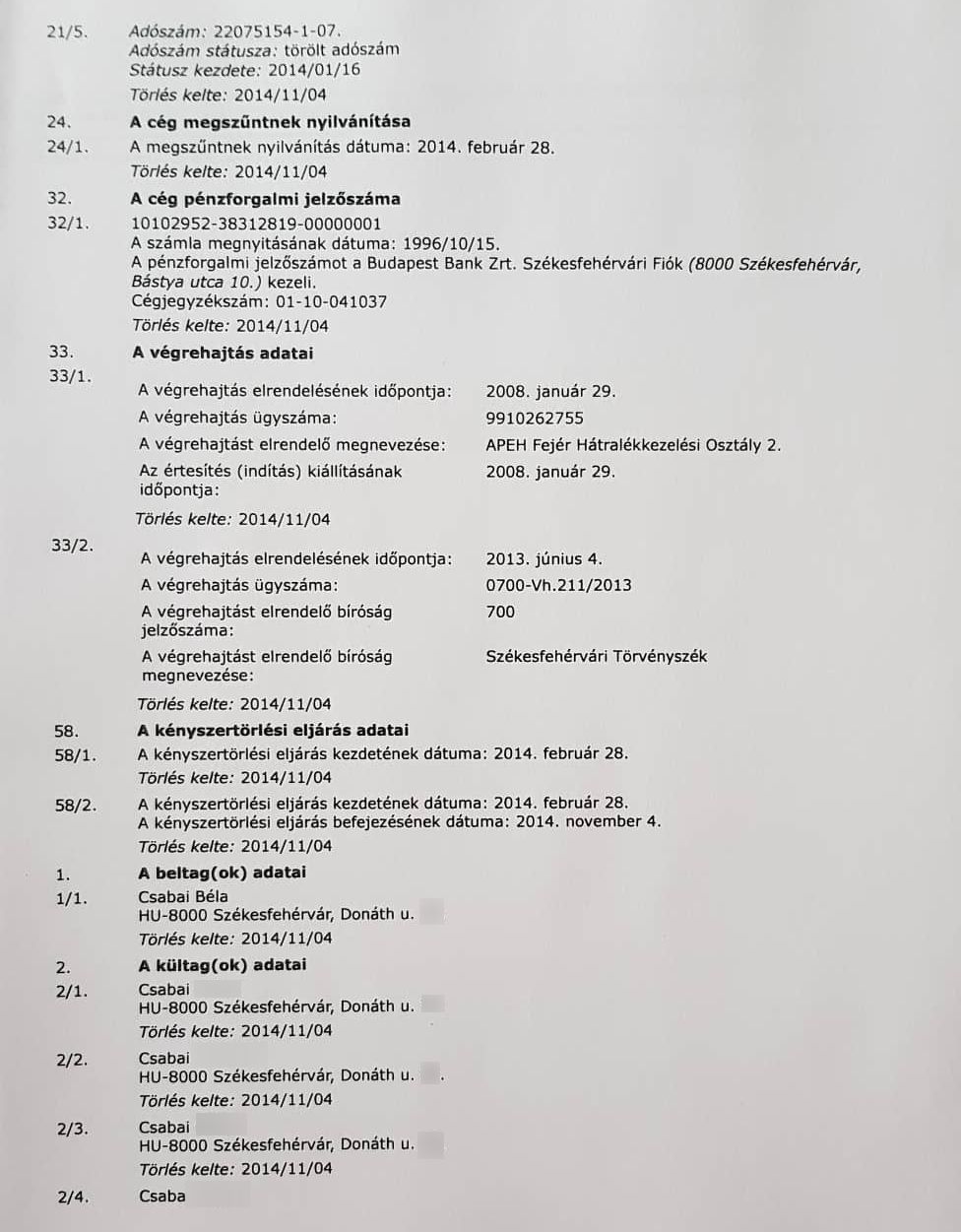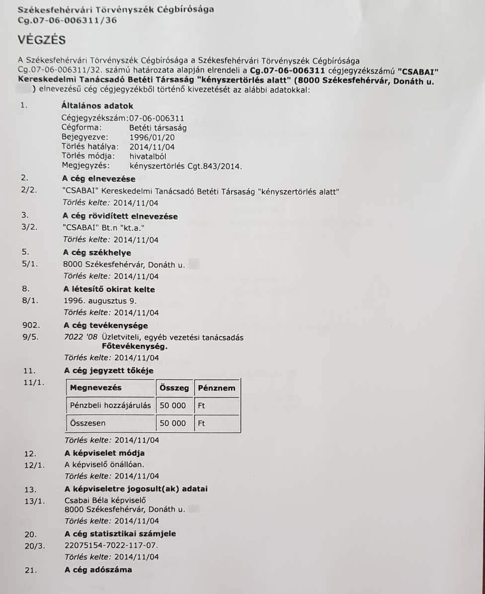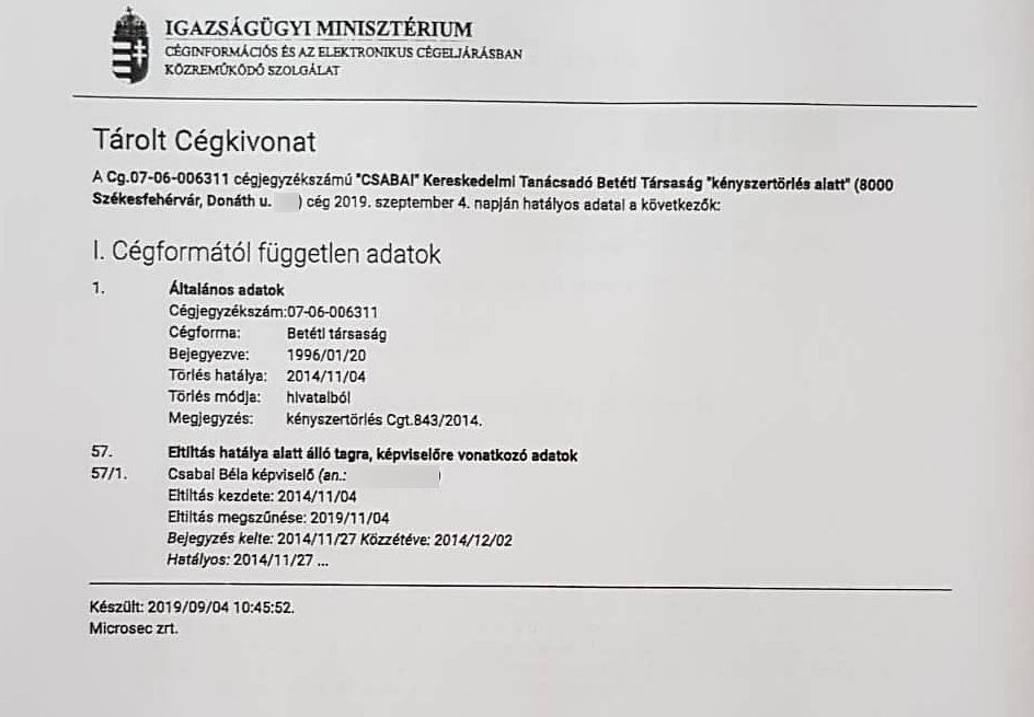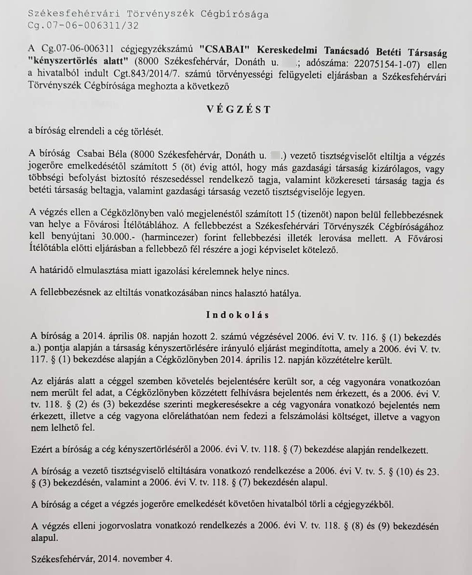 A Székesfehérvári Törvényszék Cégbírósága a nyilvános iratok alapján az ellenzéki összefogás egyik képviselőjelöltjét, Csabai Bélát eltiltotta a cégvezetéstől. A Fehérvár Televízió híradója megkérdezte az üggyel kapcsolatban az érintettet és Márton Rolandot, az ellenzéki összefogás polgármesterjelöltjét.
